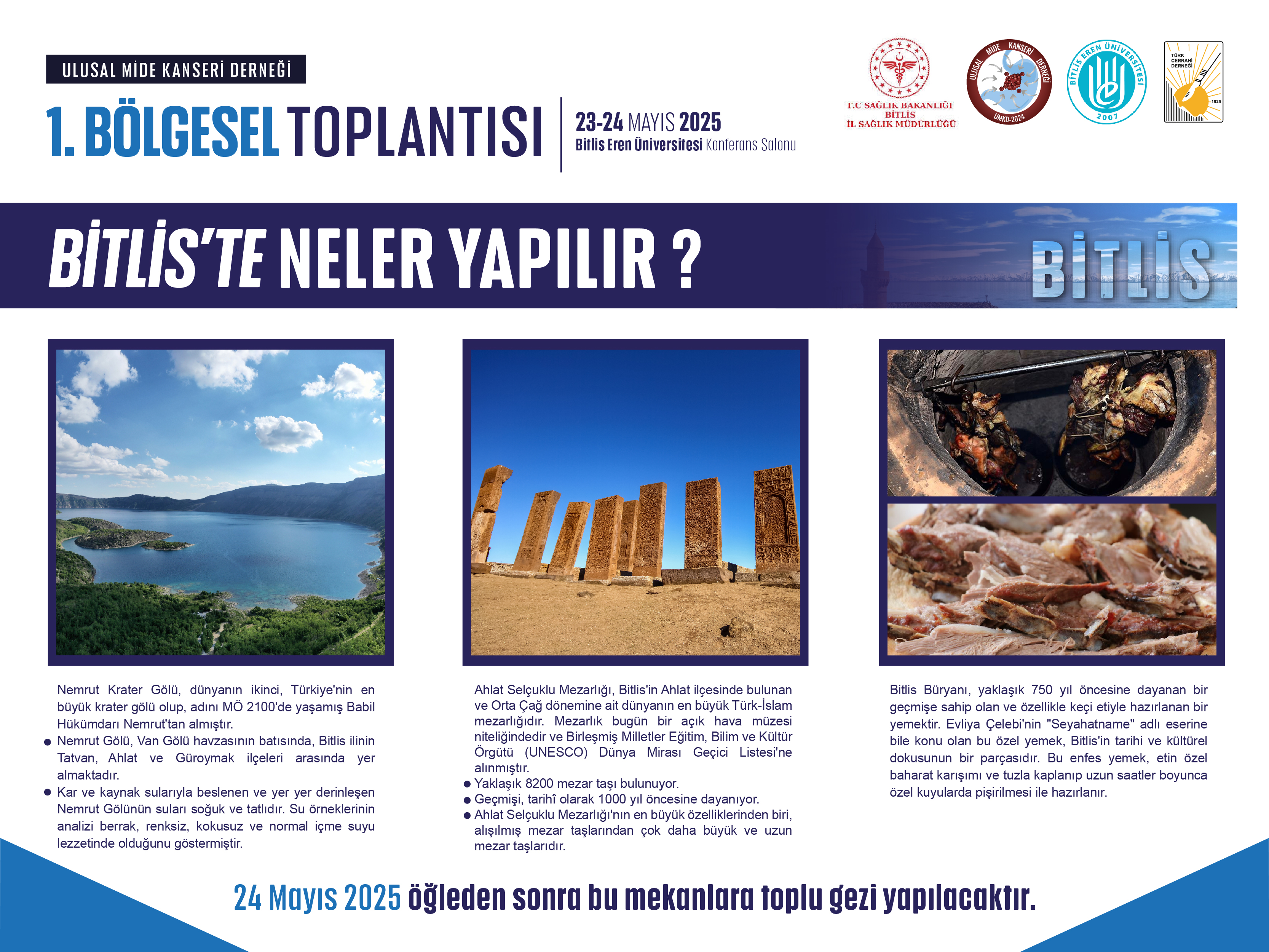 Ulusal Mide Kanseri Derneği 1. Bölgesel Toplantısı 23-24 Mayıs 2025 tarihlerinde Bitlis Eren Üniversitesi Konferans Salonu'nda gerçekleştirilecektir.