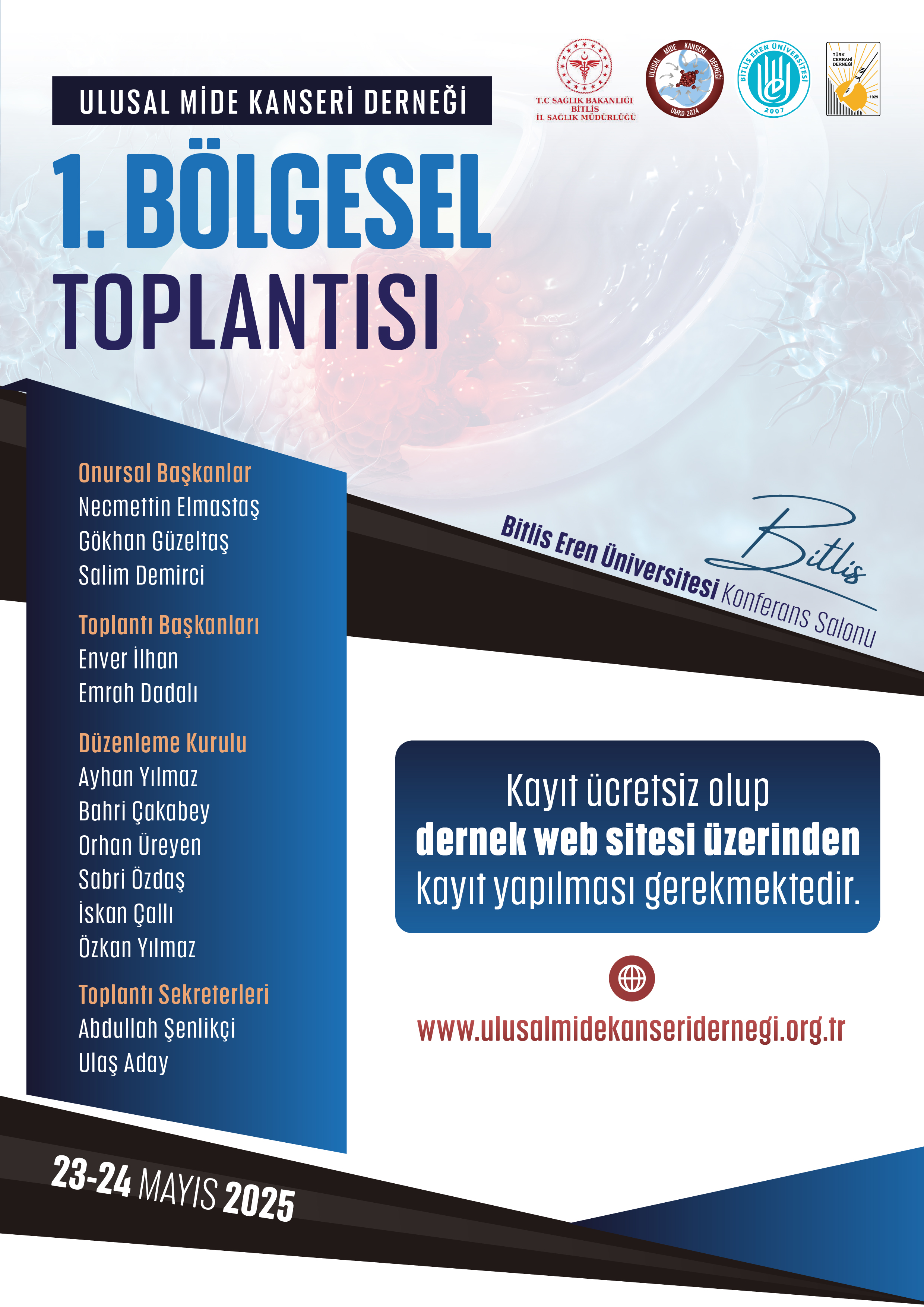 Ulusal Mide Kanseri Derneği 1. Bölgesel Toplantısı 23-24 Mayıs 2025 tarihlerinde Bitlis Eren Üniversitesi Konferans Salonu'nda gerçekleştirilecektir.